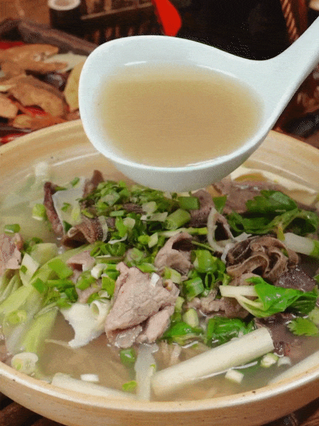 鲜香嫩滑的牛肉牛杂,醇厚滋补的肉汤,再烫上卷心菜,蘸上辣椒面就一碗米饭,在乍暖还寒的日子里,吃上这口暖和又滋补的“药膳”,实在太治愈了!