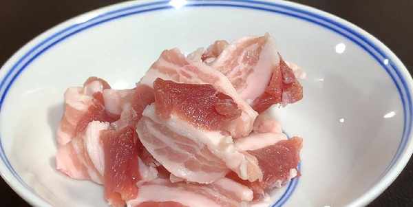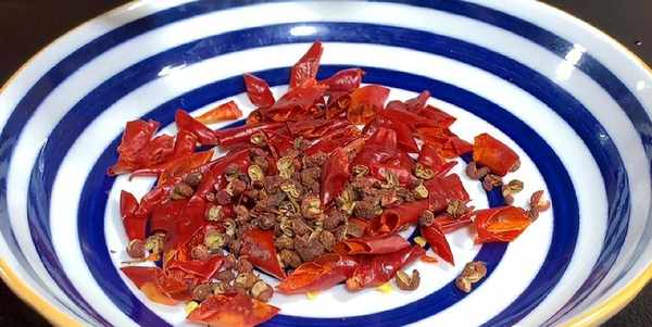 2.五花肉切成薄片 ,大蒜拍碎、生姜切末,干辣椒切成小段、在准备少许花椒、葱白切葱花、全部切好后装入碗中备用。