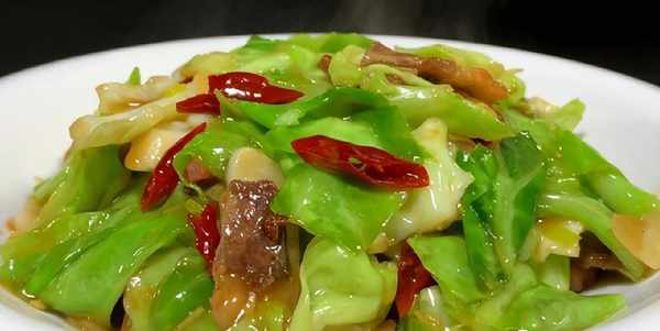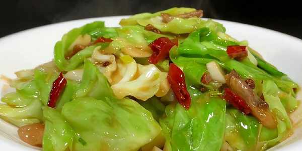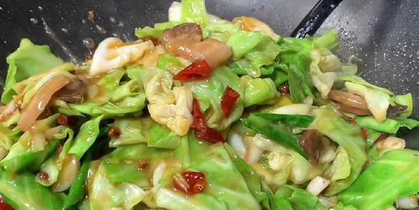 5.炒出辣味后,倒入包菜,再倒入调好的料汁,大火快速翻炒均匀,将包菜炒至入味后,加入一水淀粉勾芡,大火快速翻炒几下,就可以出锅了。