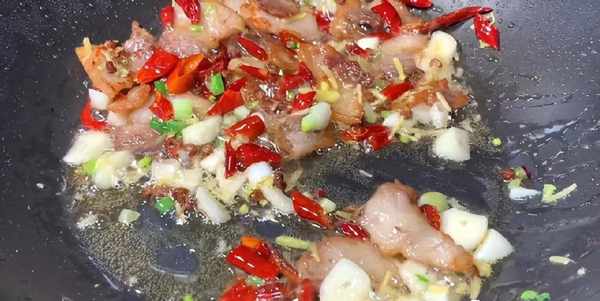 4.包菜腌制好后,用清水清洗干净,锅内倒入适量的油,油热后下入五花肉,大火快速翻炒,将五花肉的中的油脂煸炒出来,再下入姜蒜末、干辣椒、花椒,大火快速翻炒。