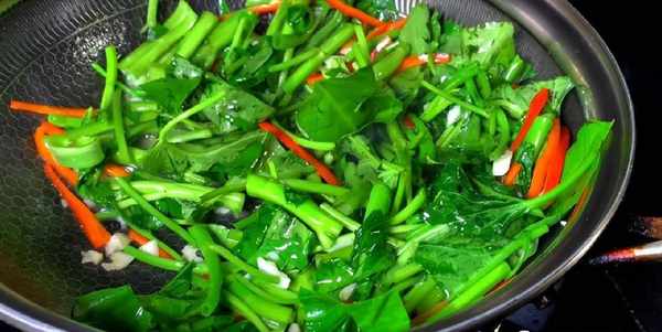 5.翻炒均匀后,倒入调好的料汁,继续大火翻炒,让料汁裹满空心菜,就可以出锅了。
