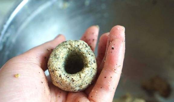 2、用手取鸡蛋大小的面团放在手心里,继续揉捏一会儿,使其变得没有面疙瘩,表面光滑后,团成椭圆形,之后用另一只手的大拇指在底部戳一个洞,边转边团,最后团成漂亮的窝窝头胚子。