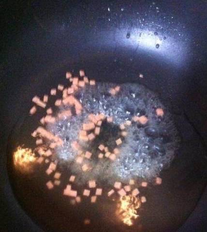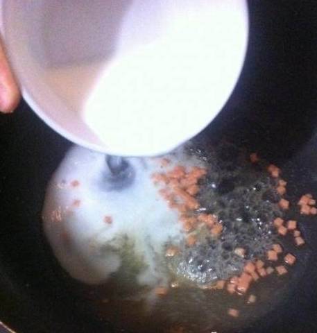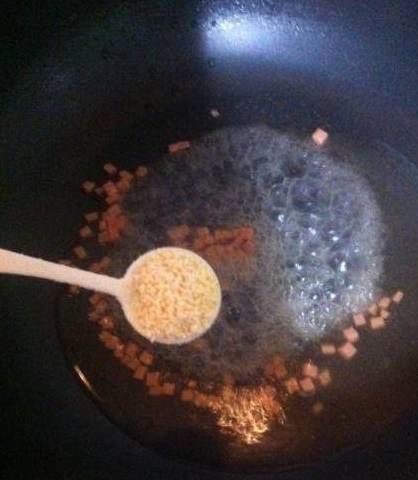 放入之前切好的火腿肠丁