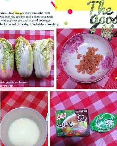 食材:娃娃菜、浓汤宝(口味随个人喜好,个人感觉猪肉比较好)、火腿肠、淀粉