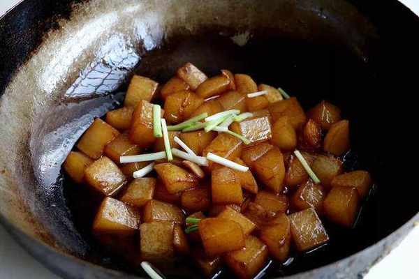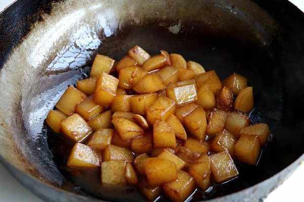 3、加入白萝卜。接着倒入切好的白萝卜翻炒几分钟,让白萝卜表面稍微焦黄。