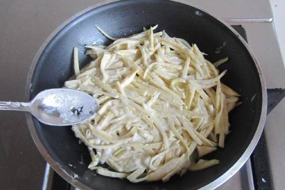 5.热锅凉油,将红薯丝倒入平铺在锅底薄薄一层;