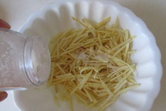 2.红薯切成细丝后放入适量的盐腌制一下;
