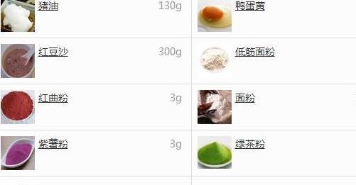 1.准备原料。蛋黄酥分为三部分,油酥、油皮和馅料。油皮需要面粉110g、猪油40g、糖粉23g、水25g。油酥需要低筋粉90g、猪油90g、紫薯粉3g、绿茶粉3g、木炭粉3g、红曲粉3g。馅料需要鸭蛋黄12枚、豆沙300g。