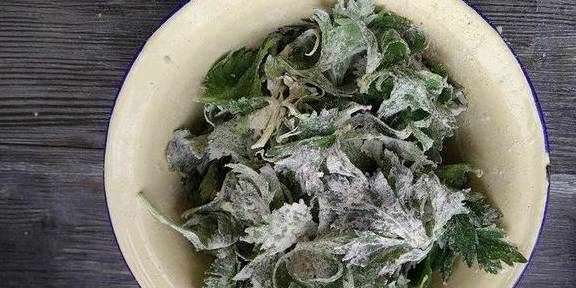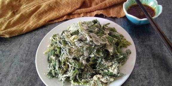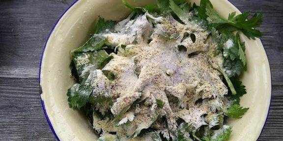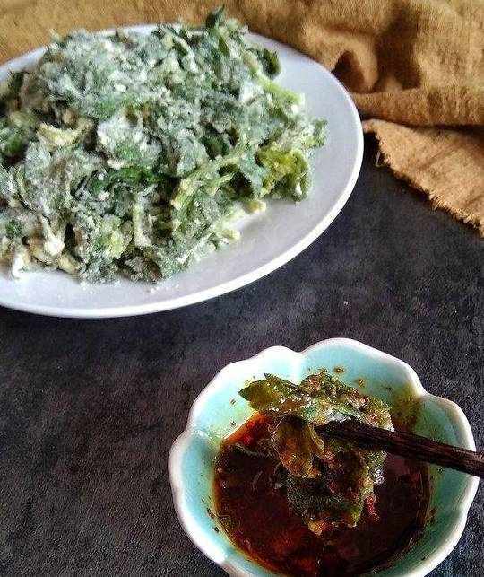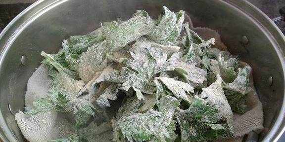 6.蒸锅里铺上笼布把拌上面粉的叶子倒在上面大火蒸5分钟即可