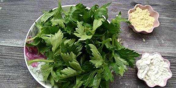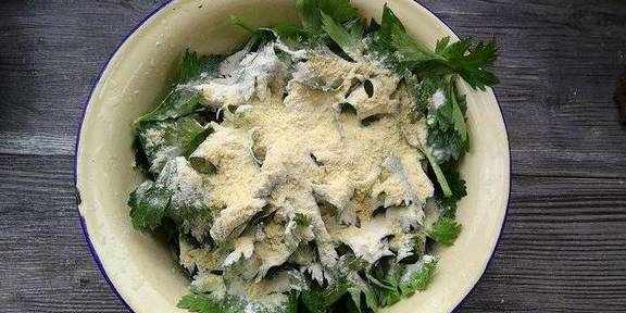 面粉50克、玉米面(黄)20克、西芹叶子150克、精盐2克、花椒粉1克