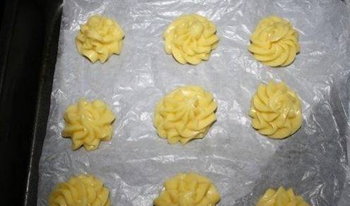 210度烤焙10-15分钟,待泡芙膨胀定型后,将温度降到180度,烤20-30分钟,直到泡芙表面黄褐色。