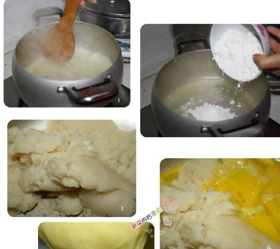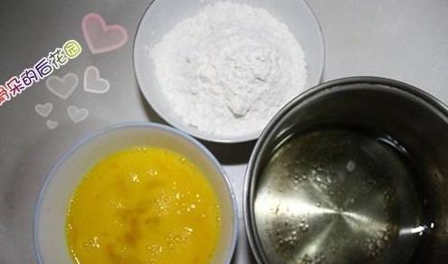 材料:低粉100g,水160g,色拉油70g,糖1小勺,盐1/2小勺,鸡蛋3个多一点