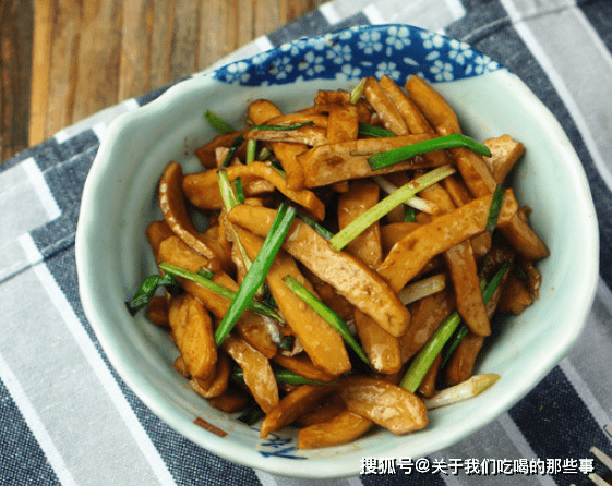 1、豆干洗干净后切成薄片,香葱洗干净后切段。起锅烧油,下入葱段炸出香味,放入豆干小火煸炒一会儿,炒至表面焦黄,没什么水分后加入生抽、食盐炒匀,小火焖一会儿,入味后即可出锅。