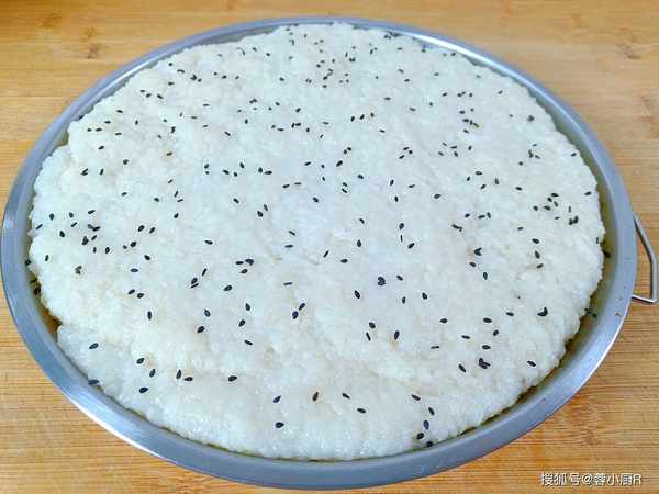 4、接着表面再撒一把黑芝麻,然后用手按压紧实,接着让它自然凉透,大约40分钟左右。