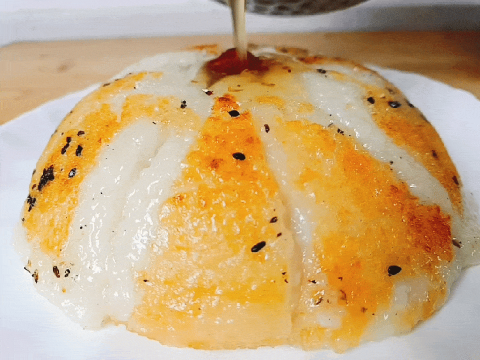 3、熬好的糖浆趁热淋到蒸好的糯米糕上面,香甜软糯好吃的糯米糕就做好了。