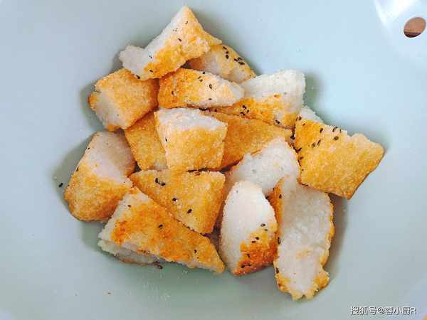 3、炸至两面金黄焦脆后,就可以把糯米糕取出来了。注意不要火太大,别炸糊了,全部炸好后取出来沥油。我们的糯米糕就炸好了,吃不完的放凉后就可以放冰箱保存了,下次吃的时候直接拿出来做就行了。