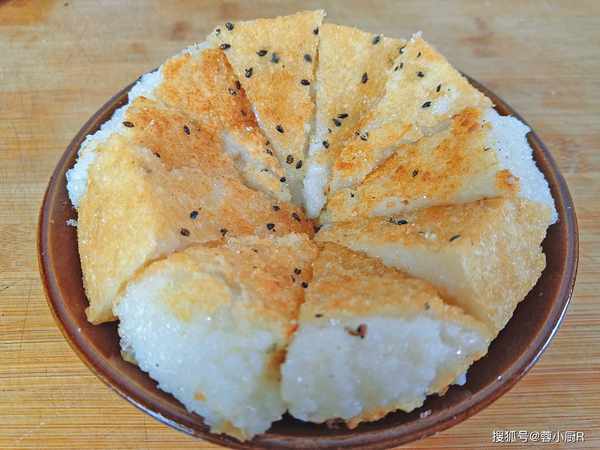 1、炸好的糯米糕先切小块儿,然后再切成小三角形,人不多的话切一大块儿就够了。