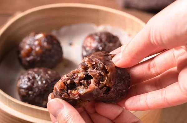 7.將煮好的豆餡分成65g小團,包入栗子,揉圓。