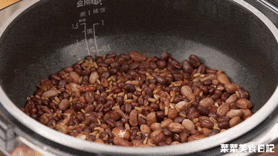 2.倒入電鍋,加入沒過一掌的水份,按煮飯/雜糧飯模式,煮至可輕鬆碾開·若沒時間浸泡,可清洗豆類後,倒入2倍水,按煮粥模式,煮至可輕鬆碾開,若第一次烹煮沒開花,繼續按煮粥模式。