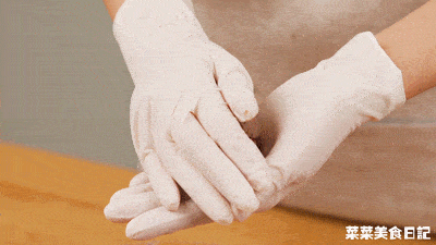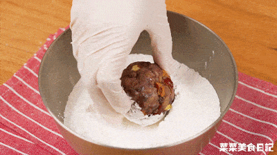 8.料理盆裏倒入100g糯米粉和30g低筋/中筋麵粉,混合均勻,放入揉好的團子,均勻蘸上麵粉,取出噴水,再蘸粉,重複3-5次,直到看不到餡料。