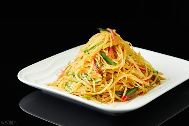 2、热锅凉油,放入土豆丝煸炒至变色。