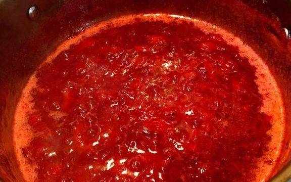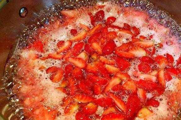 将冷藏后的草莓连同渗出的水分一起全部放入锅里,大火翻炒,(可用珐琅锅或不锈钢锅,切记不要用铁锅)。
