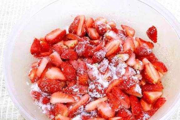 将白糖撒入切好的草莓中,用筷子搅拌均匀,使糖均匀地附着草莓上,盖上盖子,放入冰箱冷藏3小时以上(有条件的可以冷藏24小时)。