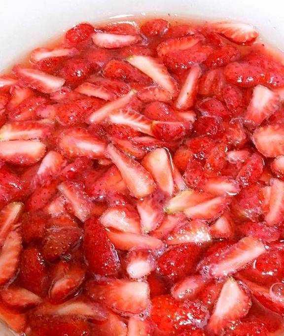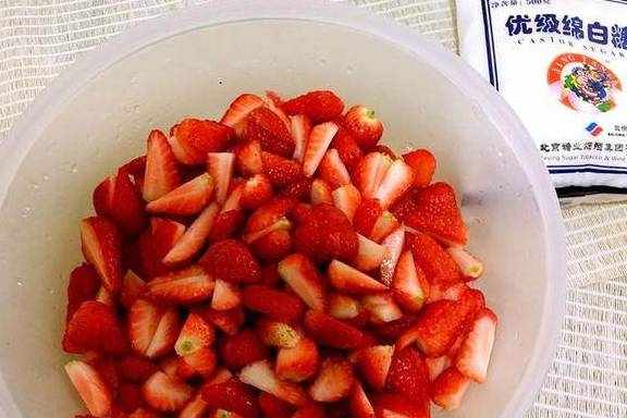 这个是在冰箱冷藏了24小时的样子。冷藏过后,草莓内的水分会渗出,此时就可以进行下一步了。(我昨天下班回家后洗洗切切,刚好今天下班回来做)