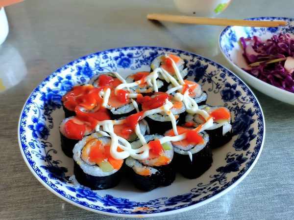 吃的时候,给寿司上淋上沙拉酱和番茄酱。