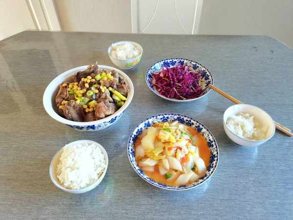 醋溜白菜,凉拌紫甘蓝,黄豆炖排骨,米饭。