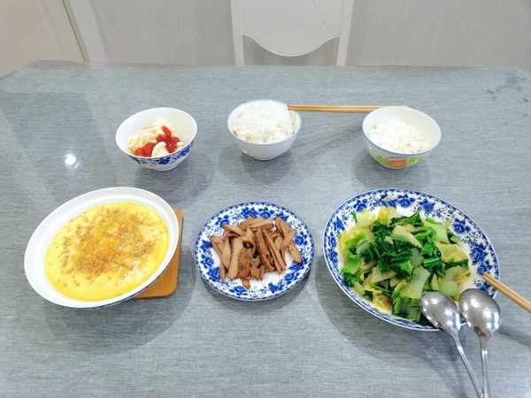 蒜泥小白菜,五香豆干,蒸鸡蛋羹,蒸铁棍山药,米饭。