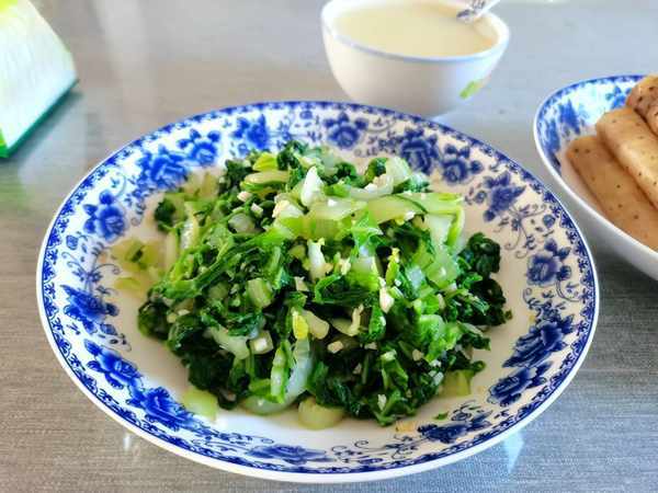 小米大米稀饭,发面烙饼,羊肉葱头包子,蒸铁棍山药,蒜泥白菜,素炒莲花菜。
