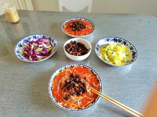 羊肉番茄拌面条,凉拌白菜心,凉拌紫甘蓝葱头。