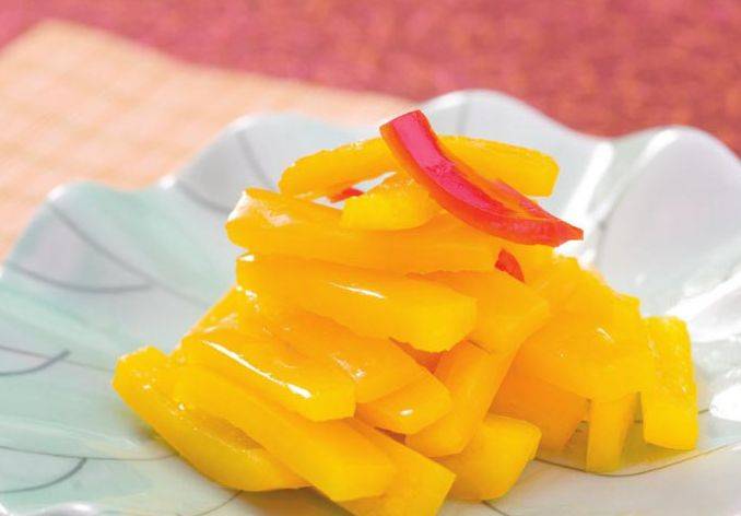 2 、甜椒去蒂及籽,洗净,捞出沥水,放入沸水锅内焯至断生,捞出晾凉。