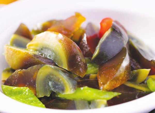 材料:松花蛋3个,青椒100克,陈醋1小匙,姜末5克,生抽、味精、香油各1/3小匙。