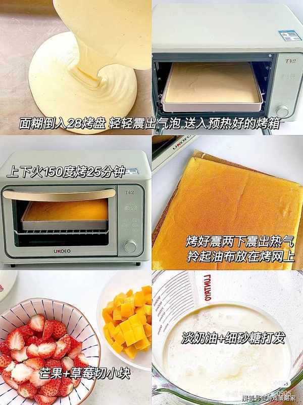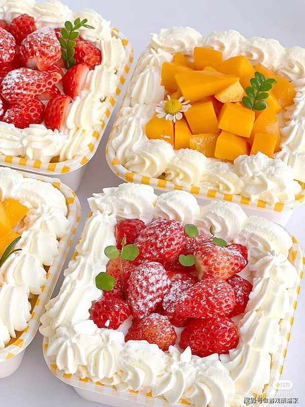 准备水果,我准备了芒果+草莓,打发淡奶油,淡奶油+细砂糖打发
