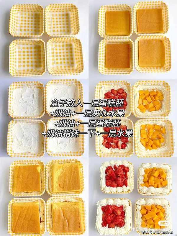 盒子放入一层蛋糕胚+奶油+一层夹心水果+奶油+一层蛋糕胚+奶油稍抹一下+一层水果 表面裱花