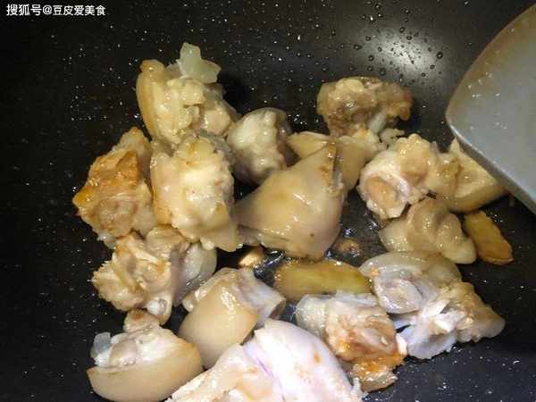 3、起锅烧油,放入冰糖,开始炒糖色。注意,炒糖色时一定要小火,而且要不停搅拌,不然一下就糊了。炒出糖色后,把猪蹄放进去,翻炒一下,让猪蹄表面均匀裹上糖色。