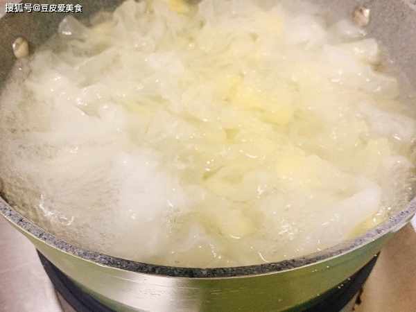 2、银耳泡好后,用手撕碎,放入锅里,倒入足够量的水,大火煮开,转中火,熬煮20分钟。