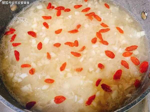4、关火,放入清洗干净的枸杞,搅拌均匀,就可以开吃了,满满的胶原蛋白。加点牛奶或椰汁,味道会更好哦。吃不完的可以密封装起来,放入冰箱保存。