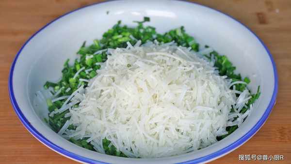 3、粉丝也泡好了,沥干水分后切碎一点,和韭菜装到一起;