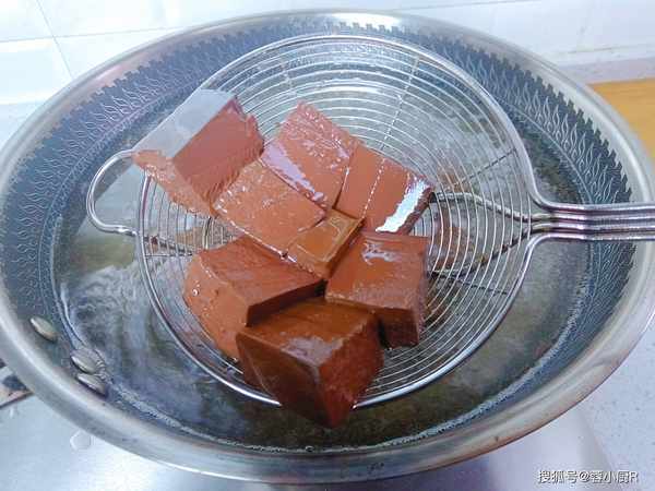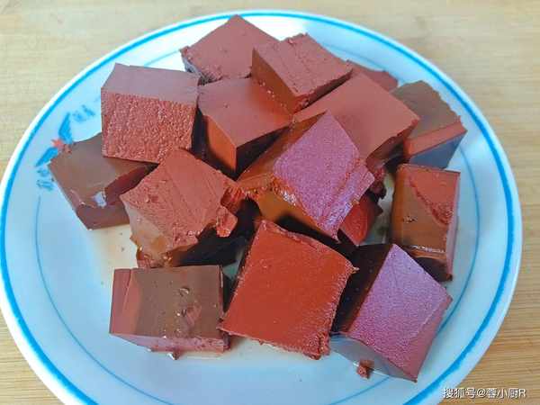 1、新鲜的猪血2块,清洗一下后切成小块儿,这里要注意的就是不要切太小,不然容易碎。
