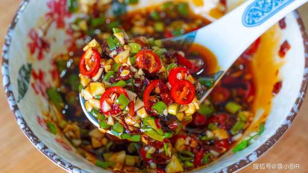 4、加蒜末、葱花、辣椒粉、热油 、香醋、生抽、盐、糖、鸡精、花椒油,拌匀后就可以啦;