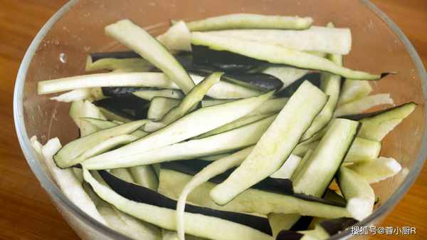 3、茄子切成长条,撒上少许的盐腌制10分钟,控干水分;
