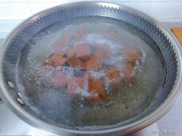 2、起锅烧水,水开倒入猪血,再加一勺料酒去腥。