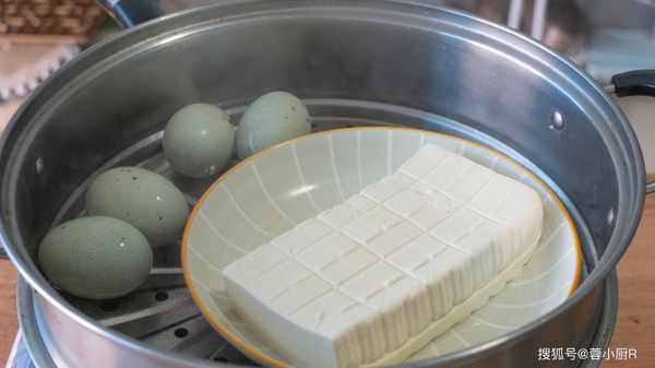 1、豆腐一块儿,皮蛋四个。起锅烧水,水开放入豆腐和皮蛋,盖上盖子大火蒸10分钟。