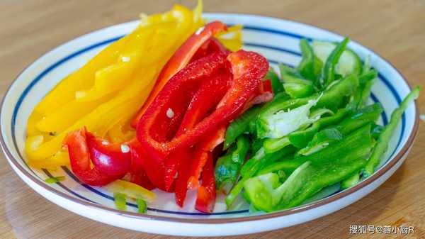2、再来切点辣椒,我用的是这种菜椒,甜甜的一点都不辣,最后再来一个青辣椒,一样的切成条就可以了,先装起来放一旁;