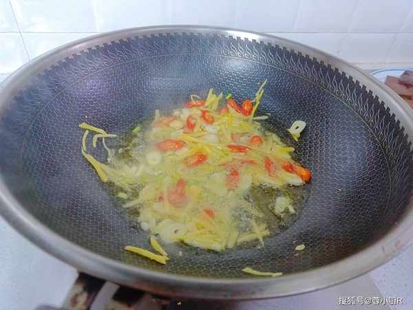 2、起锅热油,下姜丝、葱段、小米辣大火爆香。