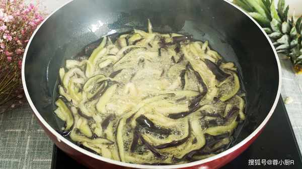 5、锅中倒油,油热之后倒入茄子,炸至稍微变色之后捞出控油,