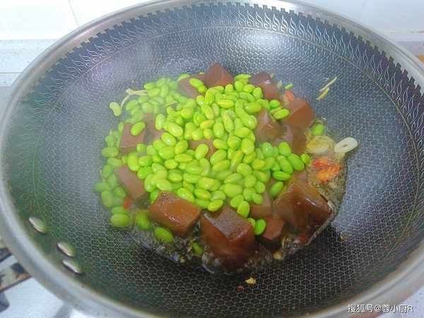 3、接着把猪血和毛豆倒进来,再加一碗清水。